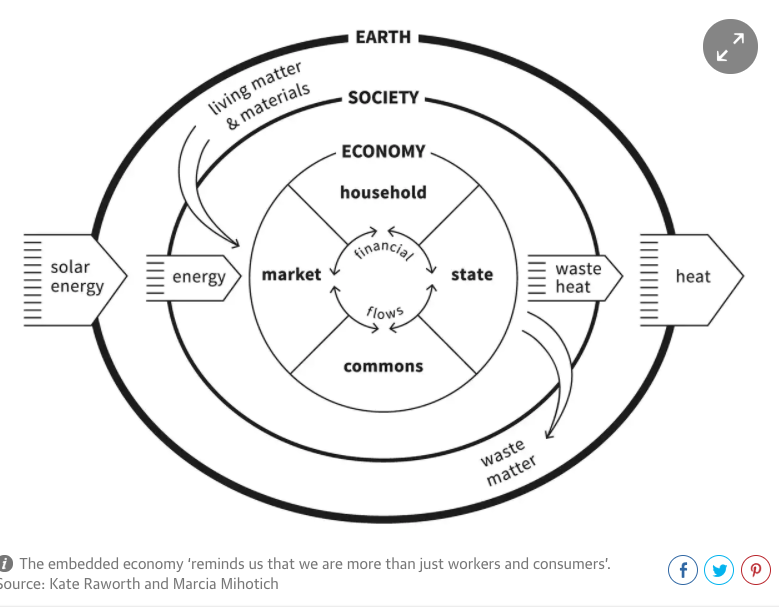 So Raworth begins by redrawing the economy. She embeds it in the Earth’s systems and in society, showing how it depends on the flow of materials and energy, and reminding us that we are more than just workers, consumers and owners of capital.