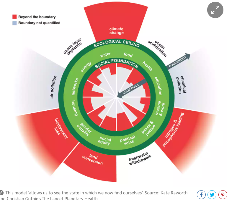 The diagram consists of two rings. The inner ring of the doughnut represents a sufficiency of the resources we need to lead a good life: food, clean water, housing, sanitation, energy, education, healthcare, democracy. Anyone living within that ring, in the hole in the middle of the doughnut, is in a state of deprivation. The outer ring of the doughnut consists of the Earth’s environmental limits, beyond which we inflict dangerous levels of climate change, ozone depletion, water pollution, loss of species and other assaults on the living world.