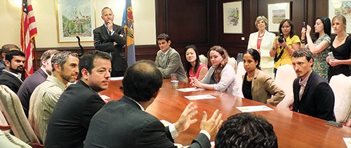 Gov. Jack Markell met with more than a dozen CEOs and other business leaders in August 2013 to celebrate the creation of the first Public Benefit Corporations in Delaware. Photo by Mark Lennihan/Associated Press.