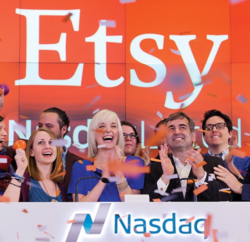Kristina Salen, center left, Etsy’s chief financial officer, and Chad Dickerson, center right, chairman and CEO of Etsy, celebrate the company’s initial public offering on April 16, 2015. Photo by Mark Lennihan/Associated Press.