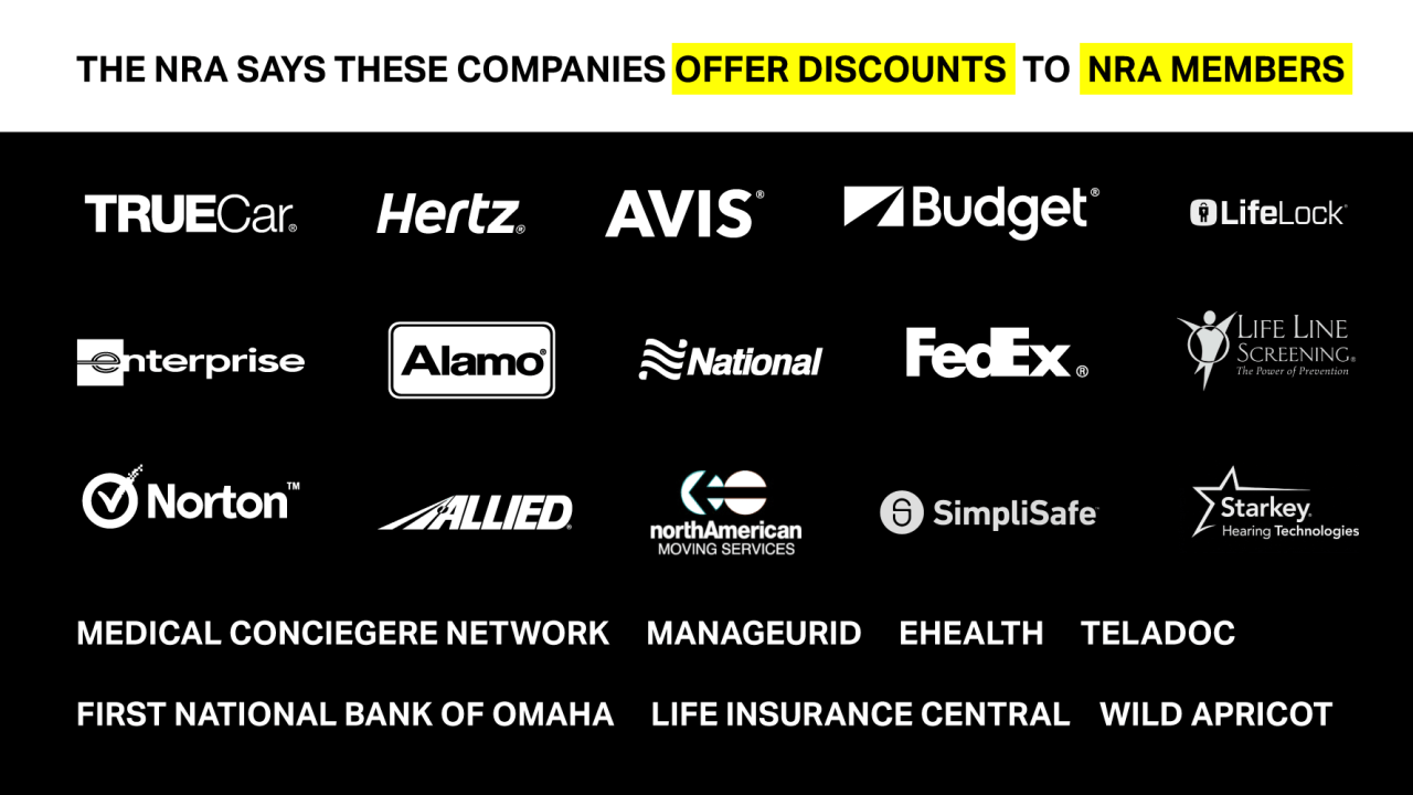 Much like AARP or AAA, the organization promotes its discounts for members as a selling point for why people should join. The “valuable 5-star benefits” promised include not just a subscription to an NRA magazine and a gun-owner liability protection policy but also savings on insurance, identity theft protection, hearing aids, car rentals, moving vans, shipping, and even wine. While some of these perks are provided by in-house subsidiaries, many are offered through corporate partners — including some household names.