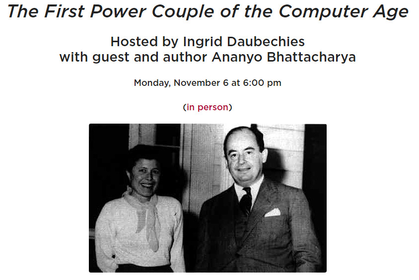 The First Power Couple of the Computer Age Hosted by Ingrid Daubechies with guest and author Ananyo Bhattacharya John von Neumann is widely recognized not only as a mathematical genius, but as a seminal founder of the computer age. In contrast, the role of his wife Klara Dan von Neumann — the first person to write a modern computer program — remains woefully unappreciated. Join MoMath’s Distinguished Visiting Professor Ingrid Daubechies and Ananyo Bhattacharya, author of the biography, The Man from the Future: The Visionary Life of John von Neumann, for a fascinating discussion about the roles this remarkable couple played in catalyzing the development of the modern computer. Ananyo will be available after the session to sign copies of his book, The Man from the Future: The Visionary Life of John von Neumann, available for purchase through Additions, the shop at MoMath. |