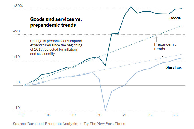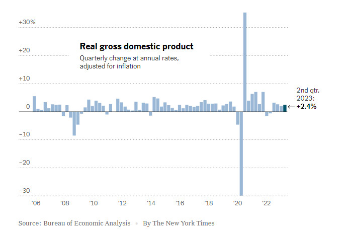The reading on gross domestic product was bolstered by consumer spending, showing that recession forecasts early in the year were premature, at least. Written by Ben Casselman July 27, 2023 (Accessed November 2023) The economic recovery gained momentum in the spring as buoyant consumer spending and resurgent business investment helped, once again, to keep a recession at bay. Gross domestic product, adjusted for inflation, rose at a 2.4 percent annual rate in the second quarter, the Commerce Department said Thursday. That was up from a 2 percent growth rate in the first three months of the year and far stronger than forecasters expected a few months ago. Consumers led the way, as they have throughout the recovery from the severe but short-lived pandemic recession in 2020. Spending rose at a 1.6 percent rate, slower than in the first quarter but still solid. Much of that growth came from spending on services, as consumers shelled out for vacation travel, restaurant meals and Taylor Swift tickets. Consumers didn’t carry all the weight, however. Business investment rebounded in the second quarter after slumping in the first three months of the year, and increased spending by state and local governments contributed to growth. “If you’re looking for a working definition of ‘resilient,’ look no further than the American economy,” said Joseph Brusuelas, chief economist at RSM. “This is absolutely rock-solid.” ![]() Change in personal consumption expenditures since the beginning of 2017, adjusted for inflation and seasonality. Source: Bureau of Economic Analysis ... By The New York Times The persistent strength of the economy has surprised economists, many of whom thought that high inflation — and the Federal Reserve’s efforts to stamp it out through aggressive interest-rate increases — would lead to a recession, or at least a clear slowdown in the first half of the year. For a while, it looked as if they were going to be right: Tech companies were laying off tens of thousands of workers, the housing market was in a deep slump and a series of bank failures set up fears of a financial crisis. Instead, layoffs were mostly contained to a handful of industries, the banking crisis did not spread and even the housing market has begun to stabilize. The job market stayed strong, giving Americans money to spend: Personal income, after taxes and adjusted for inflation, rose at a 2.5 percent rate in the second quarter. “The things we were all freaked out about earlier this year all went away,” said Michael Gapen, chief U.S. economist at Bank of America. Inflation has also slowed significantly. Consumer prices rose at a 2.6 percent rate in the second quarter, down from 4.1 percent in the first quarter and from more than 7 percent in the first half of last year. That has eased pressure on the Fed to keep raising rates, leading some forecasters to question whether a recession is such a sure thing after all. Jerome H. Powell, the Fed chair, said on Wednesday that the central bank’s staff economists no longer expected a recession to begin this year. White House officials pointed to the report as evidence that President Biden’s economic policies, including investments in infrastructure and green energy, were paying off. In a blog post on Thursday, the president’s Council of Economic Advisers noted that investment in manufacturing facilities had contributed more than a third of a percentage point to overall G.D.P. growth, the most in more than four decades. Mr. Biden, in a statement, said the data was evidence of “Bidenomics in action.” Weiler, a manufacturer of paving and forestry equipment, recently opened a 120,000-square-foot building at its Knoxville, Iowa, headquarters. The company will use only about a quarter of the space right away, said Patrick Weiler, its president and chief executive. But he is betting on continued growth. “We just think we’ve got a pretty good future, and it seemed like a logical investment,” he said. Demand has been strong coming out of the pandemic, Mr. Weiler said. Now that supply-chain disruptions are being resolved — for a while, the company had trouble getting the engines that power its equipment — he can meet that demand. Federal infrastructure spending, he added, should help keep sales strong even if private demand slows. “There’s very good end-user confidence because they see a lot of work coming,” Mr. Weiler said. Still, many economists say consumers are likely to pull back their spending in the second half of the year, putting a drag on the recovery. Savings built up earlier in the pandemic are dwindling. Credit card balances are rising. And although unemployment remains low, job growth and wage growth have slowed. “All those tailwinds and buffers that were supporting consumption are not as strong anymore,” said Blerina Uruci, chief U.S. economist at T. Rowe Price. “It feels to me like this hard landing has been delayed rather than canceled.” Ben Casselman writes about economics, with a particular focus on stories involving data. He previously reported for FiveThirtyEight and The Wall Street Journal. More about Ben Casselman A version of this article appears in print on July 28, 2023, Section B, Page 4 of the New York edition with the headline: U.S. Economy Grows As Recession Again Fails to Materialize. Order Reprints | Today’s Paper | Subscribe Editors’ Picks