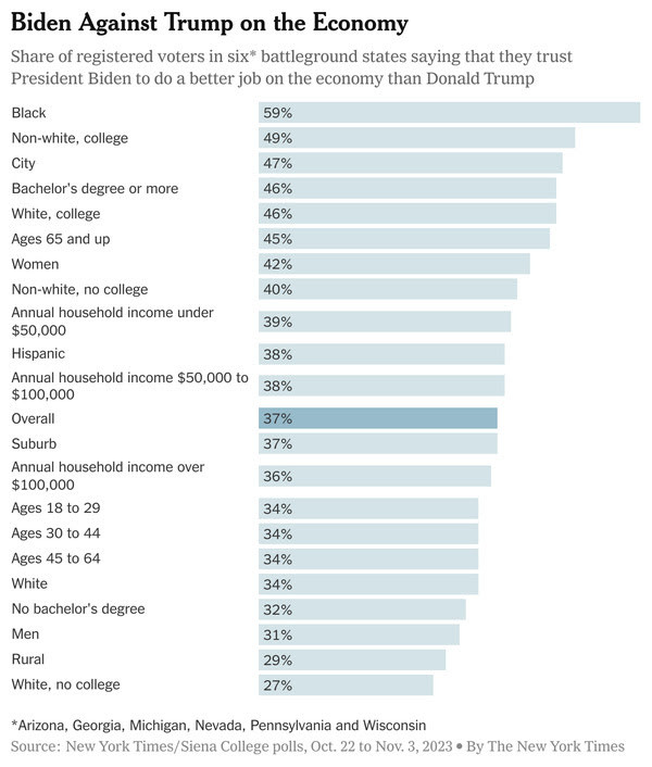 Robert Reich November 16th 2023, 4:03 AM Forwarded this email? Subscribe here for more Why are so many people so down on Biden’s economy? ... My answer, and a proposal for what Biden must do ROBERT REICH Friends, A few days ago, I had a long talk with my old friend Jared Bernstein, who chairs Biden’s Council of Economic Advisers. Jared worked for me 30 years ago at the Labor Department, and, as I reminded him, his career has been on a downward trajectory ever since. The Council of Economic Advisers is now preparing its annual Economic Report of the President, so it seemed an especially good time to ask Jared for his take on the weirdest thing about today’s economy, which is rattling Democratic politics to the bone: The gap between the data showing a good economy and the public’s perception that the economy stinks. Consider: The economy grew 4.9 percent over the last quarter. Unemployment has been under 4 percent for the last 21 months. Median household wealth has grown by 37% since the pandemic. Wages have been growing faster at the bottom of the economy than at the top. And inflation is way down from where it was a year ago. The Consumer Price Index slowed to 3.2 percent last month on a year-over-year basis, after peaking at just above 9 percent on an overall basis in the summer of 2022. The economic data is about as good as it gets. And yet the American public doesn’t see it this way. To the contrary, in the recent Times-Siena College poll, only 2 percent of Americans said the economy is excellent. Just 19 percent think it’s even good. Over 80 percent say it’s fair to poor. Other polls show much the same, or worse. How to explain this discrepancy? Some economists, such as Paul Krugman, think the public is being irrational. But that’s no answer. The public can’t be irrational about its perceptions. The more Joe Biden tells Americans how great Bidenomics is, the more people report that Biden is “out of touch.” Jared’s answer is more nuanced. He thinks questions about the economy are really understood by the public as questions about the state of the nation and the world, which most people find deeply worrisome. After all, the past few years have featured the deaths of more than a million Americans from COVID, the attack on the Capitol, double-digit inflation, Putin’s invasion of Ukraine, climate-induced floods, hurricanes, and wildfires, and now a horrific war in Israel. Most people are still deeply rattled. Jared could be right, but I think he’s missing something else. Just as people don’t think about the economy in isolation, they also don’t think of the “economy” in absolute terms. They think about it in relative terms — relative to where it used to be, relative to where they think it should be. Americans instinctively compare the economy they’re living in to the one their parents or grandparents lived in — one in which the middle class was growing, almost everyone was doing better than before, and housing was affordable. Many of the young people I know are stressed by the high costs of housing and home repairs, child care, cars and car repairs, and health care. They don’t view the current economy as terrific. In fact, compared to the economy of the 1960s, the current economy is hardly terrific. If you lack a four-year college degree, it’s even worse. This is especially the case in so-called “battleground” states such as Michigan, Wisconsin, and Pennsylvania — places that 50 years ago provided millions of high-paying union jobs but are now economic backwaters. Take a look at the following chart, which shows the share of battleground state voters who trust Biden to do a better job on the economy than Trump, and you see what I mean. For example, note that less than a third of the white working class with no college education trusts Biden to do a better job on the economy than Trump. ![]() Why do they trust Trump to do a better job on the economy than Biden? Because they remember Trump loudly (and hypocritically) “fighting” for them — condemning the Chinese and other exporters to America, lashing out at Mexico and NAFTA, criticizing Europe for “taking advantage” of us, and going after “coastal elites” and the “deep state” for rigging the economy against average working people. (I say “hypocritically” because Trump was in fact the champion of the billionaire class, giving them the biggest tax cut they’ve ever had.) In other words, it’s not that Trump did a better job on the economy than Biden. He didn’t. It’s that many people — especially working-class Americans in battleground states — had a sense he was fighting for them against their perceived “enemies.” What does this suggest for Biden? Biden should take on the CEOs of big corporations and Wall Street, which continue to be the real sources of wage suppression in America. Biden has already walked a picket line and supported striking workers. He’s the most pro-worker and pro-labor president we’ve had in memory. And his administration is fighting corporate monopolies harder than any administration since the 1960s. It would be a small and logical step for Biden to let loose on the denizens of the Street and C-suites who are demanding bigger profits and lower wages and are using corporate earnings to buy back shares of stock. Biden is doing a good job on the economy, but that doesn’t matter if the public doesn’t believe it. For them to believe it, he has to show himself as a fighter. What do you think? Leave a comment Share Upgrade to paid So glad you can be here today. Please consider becoming a paid subscriber of this community so we can do even more.