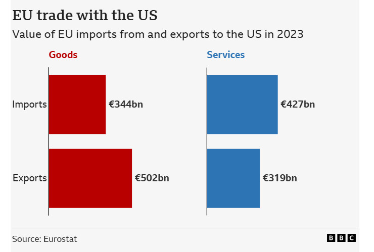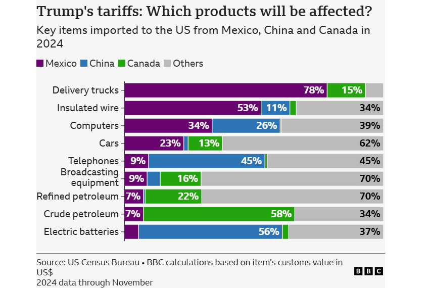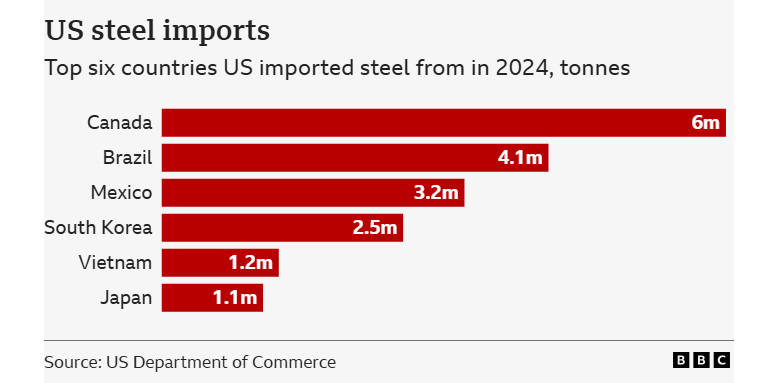 13 March 2025 Jennifer Clarke ... BBC News The US has introduced a 25% tariff on all steel and aluminium imports from around the world. In response, Canada and the EU have announced new tariffs on US goods worth billions of dollars, stoking fears of a global trade war. President Donald Trump has threatened to impose a 200% tariff on alcohol from EU countries unless the bloc scraps its 'nasty 50% tariff on whisky'. Trump has already imposed 25% tariffs on other imports from Mexico and Canada - with some exemptions - and a 20% levy on Chinese goods. What are tariffs and how do they work? Tariffs are taxes charged on goods imported from other countries. The companies that bring the foreign goods into the country pay the tax to the government. Typically, tariffs are a percentage of a product's value. A 20% tariff on Chinese goods means a product worth $10 (£7.76) has an additional $2 charge. Firms may choose to pass on some or all of the cost of tariffs to customers. The US has typically charged lower tariffs on goods than other countries. Economists fear Trump's new taxes - and the further tariffs on foreign imports that he has suggested may start on 2 April - could lead to a sharp increase in the prices consumers pay in the US and around the globe. BBC reporters answer your tariff questions Why is Trump using tariffs? Tariffs are a central part of Trump's overall economic vision. He says tariffs will boost US manufacturing and protect jobs, raising tax revenue and growing the domestic economy. He also wants to restore America's trade balance with its foreign partners - reducing the gap that exists between how much the US imports from and exports to individual countries. But he has refused to rule out the prospect of a recession as a result of his trade policies, which sent US stocks sharply down in the days before the metal tariffs took effect. US Commerce Secretary Howard Lutnick later said the tariffs were 'worth it' even if they did lead to an economic downturn. Trump's tariffs initially targeted goods from China, Mexico and Canada. These accounted for more than 40% of imports into the US in 2024. But Trump has accused the three countries of not doing enough to end the flow of migrants and illegal drugs such as fentanyl into the US. All three countries have rejected the accusations. Trump's tariffs risk economic turbulence - and voter backlash Faisal Islam: Trump is no longer swayed by the stock markets Is the US really heading into a recession? How do the steel and aluminum tariffs work? The 25% tariffs on all US imports of steel and aluminum began on 12 March. The US buys more steel than any other country - with Canada, Brazil and Mexico its top three suppliers. ![]() Canada is also the largest supplier of aluminum to the US, providing almost 60% of the amount imported. When Trump first announced the tariff on steel and aluminium imports, he said there would be no exceptions. On 11 March, he threatened to double the levy for Canadian metals because of that country's decision to charge more to electricity customers in three northern US states, in response to other US tariffs. Trump scrapped this plan just hours before it was due to take effect, after Canada agreed to suspend the extra energy charges. Trump previously announced tariffs of 25% on steel and 10% on aluminium in 2018, during his first term as president. However, he later negotiated exceptions for many countries including Australia, Canada and Mexico. Despite those previous exemptions, tariffs raised the average price of steel and aluminium in the US by 2.4% and 1.6% respectively, according to the US International Trade Commission. Three American goods that could rise in price due to metal tariffs How have other countries reacted to the steel tariffs? In the hours after the levy took effect, Canada and the EU both announced retaliatory tariffs. Canada introduced a 25% tariff on an additional C$29.8bn ($20bn; £16bn) worth of US goods from 13 March. This includes steel products worth C$12.6bn, sports equipment, computers and cast iron items. Incoming Canadian PM Carney ready to talk trade with Trump if 'there's respect for sovereignty' The EU tariffs will target US goods worth €26bn (£22bn), and will start on 1 April and be fully in place on 13 April. They will cover items ranging 'from boats to bourbon to motorbikes', in addition to steel and aluminium goods such as pipes, window frames and tin foil. European Commision President Ursula von der Leyen said she 'deeply regrets this measure'. Tariffs are 'bad for business and worse for consumers', she added. Writing on his social media site, Truth Social, Trump said that if the EU's 50% tax on US whiskey was not removed 'immediately', the US would levy a 200% tariff on all wines, Champagnes and alcoholic products coming out of EU represented countries. 'This will be great for the Wine and Champagne businesses in the US,' he added. EU braces for higher prices as US trade war ramps up The UK exports hundreds of millions of pounds worth of steel to the US every year. Prime Minister Sir Keir Starmer told MPs that the UK will take 'pragmatic approach' to the US tariffs, but confirmed it will 'keep all options on the table'. How will the latest Trump tariffs affect the UK? China's foreign ministry said the country would take 'all necessary measures' to safeguard its rights and interests, arguing that the tariffs breached World Trade Organization rules. What is happening with the other tariffs against Canada and Mexico? Trump has already introduced 25% tariffs on other goods from both US neighbours, Canada and Mexico. These were originally due to start on 4 February but were delayed for a month to allow further negotiations. The 25% tariffs began on 4 March, with a 10% tariff on Canadian energy imports. On 5 March, Trump announced a month-long tariff exemption for cars made in North America which comply with the continent's existing free trade agreement, the US-Mexico-Canada agreem